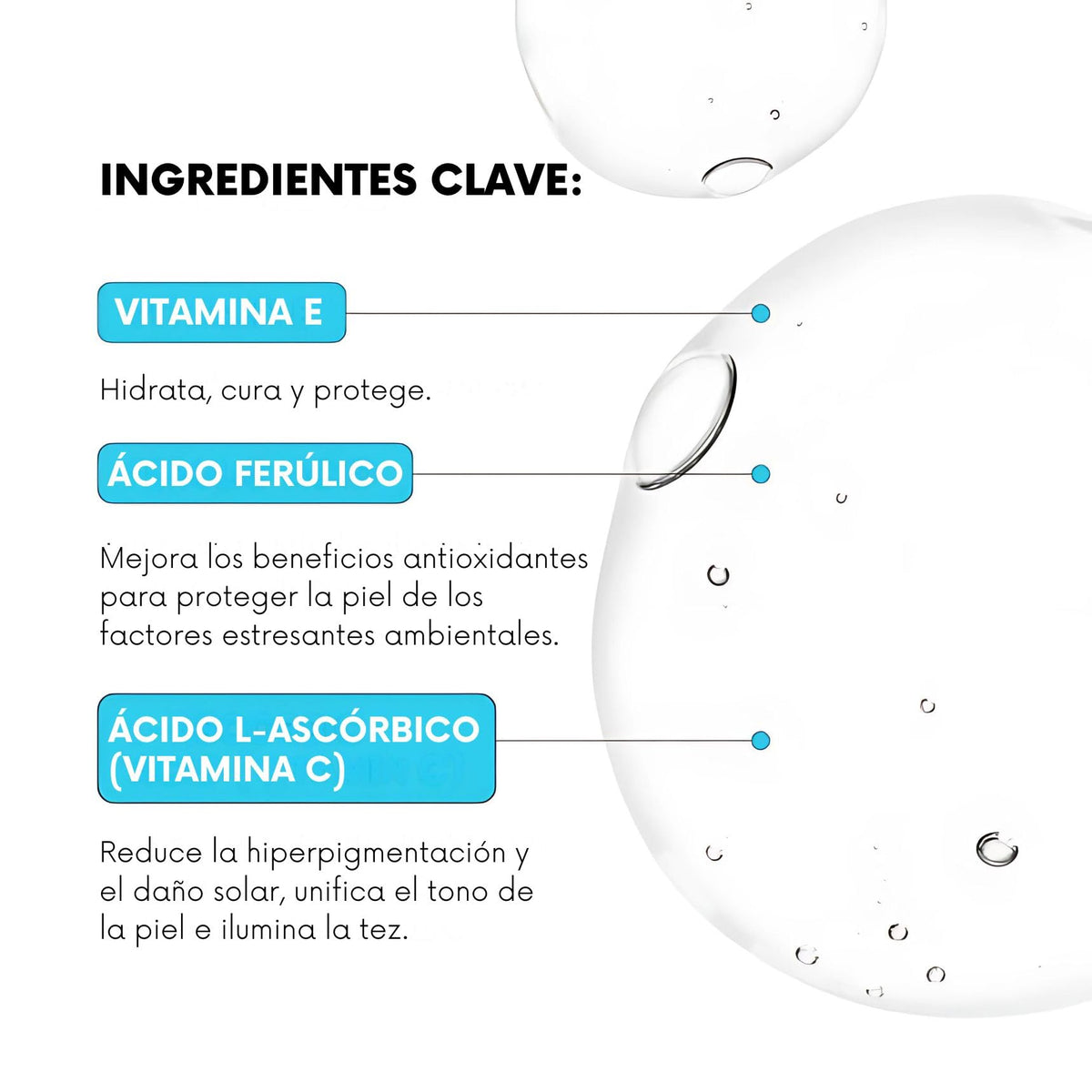 Ingredients :: Water, Ethoxydiglycol, L-Ascorbic Acid, Propylene Glycol, Alpha Tocopherol, Polysorbate 80, Panthenol, Ferulic Acid, Sodium Hyaluronate, Benzylalcohol, Dehydroacetic Acid.