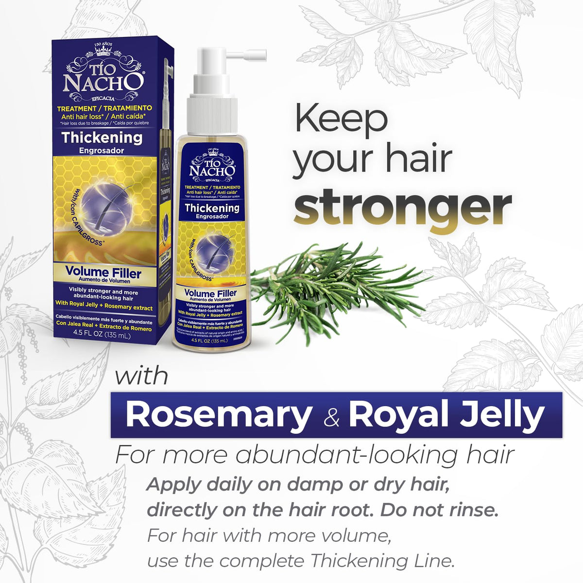 - [NATURAL INGREDIENTS] : Developed with Royal Jelly, and a unique blend of natural extracts including Hop, Rosemary, Nettle, and Alfalfa, Tio Nacho's Thickening Treatment is designed to enhance your hair's abundancy and strength.