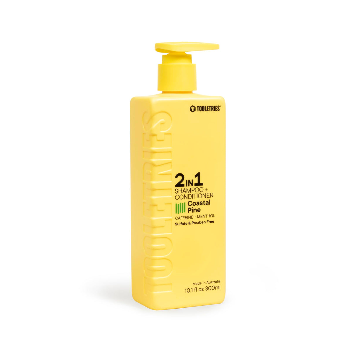 Tooletries 2-in-1 Coastal Pine Men's Shampoo and Conditioner is a pine-scented hair wash designed to promote hair growth. Infused with menthol and caffeine, this sulfate and paraben-free formula nourishes and revitalizes the hair.