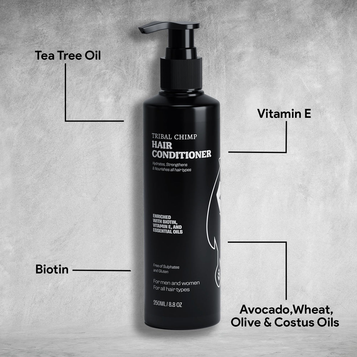 Tribal Chimp Hair Conditioner is a moisturizing and strengthening formula enriched with peppermint, tea tree oil, and biotin. This 8.8 oz conditioner provides deep hydration and nourishment to your hair, leaving it soft, smooth, and revitalized.