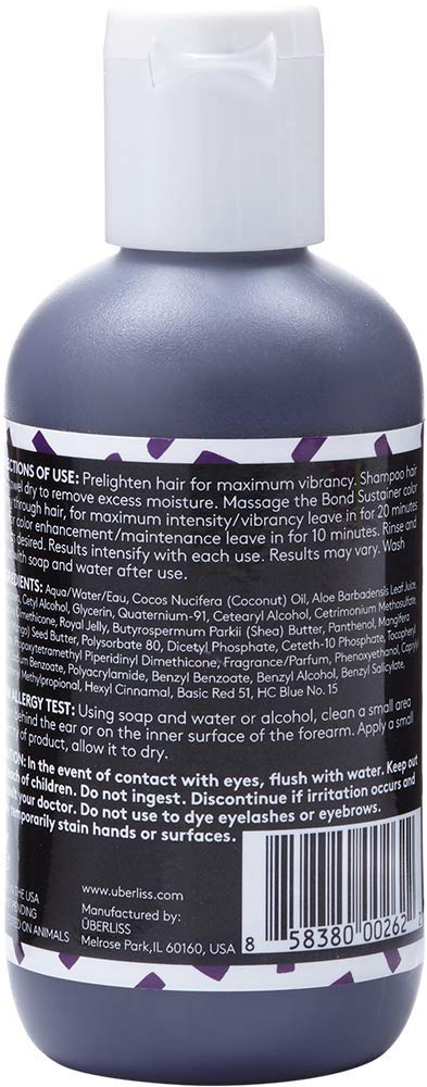 Uberliss Bond Sustainer Color in Purple Iris is a color-depositing conditioner that rebuilds and strengthens hair bonds. This 3.7oz semi-permanent dye enhances hair color while providing nourishment and repair, leaving your hair healthy and vibrant.