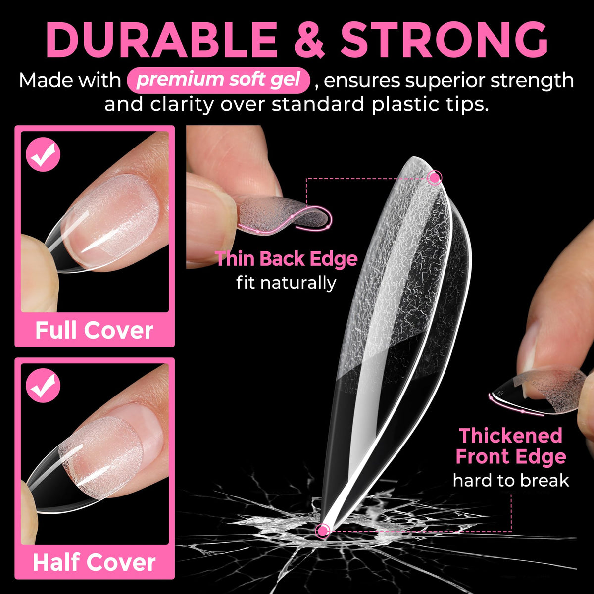UNA GELLA Short Almond Fake Nails 216pcs Pre-shape Gel Acrylic Nail Tips for Full Cover Nail Extension Home DIY Nail Salon 12 Sizes Gelly Tips