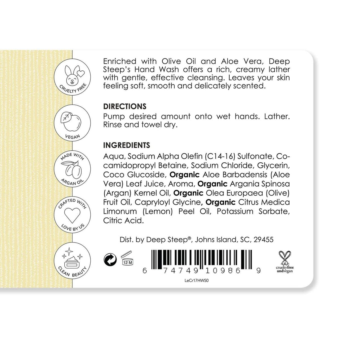 UNKNOWN Deep steep argan oil liquid hand wash in lemon cream scent offers a luxurious hand washing experience. This gentle formula cleanses effectively while leaving your hands soft and delicately scented.