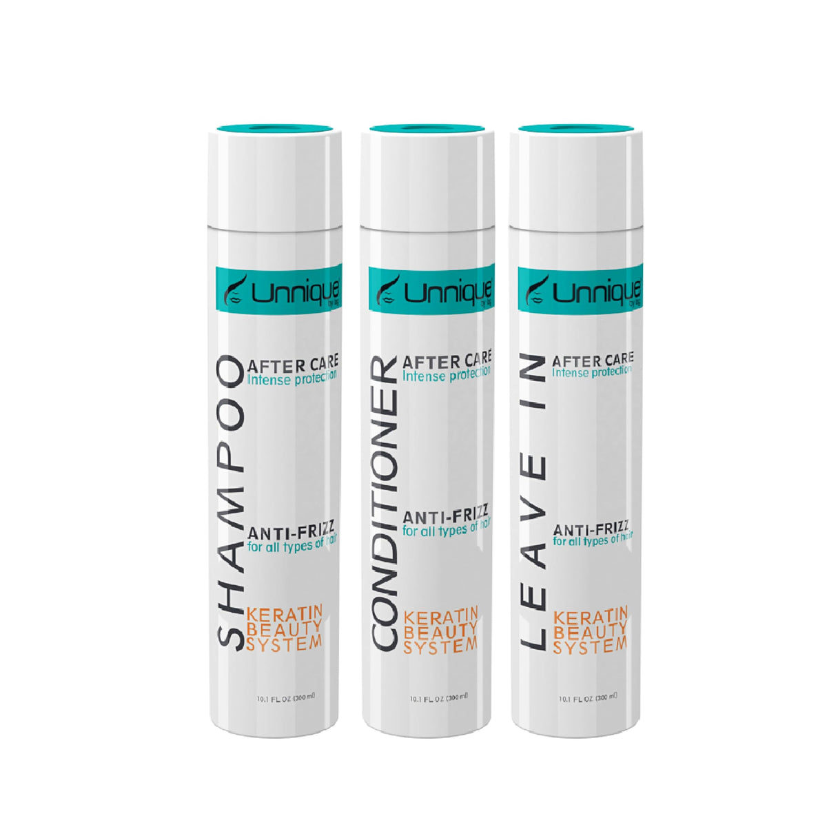 Nourish and repair your keratin-treated hair with the UNNIQUE KBS Hair Care Kit. This set includes Repairing Shampoo, Conditioner, and Leave-in Treatment for comprehensive aftercare that maintains the health and beauty of your hair.