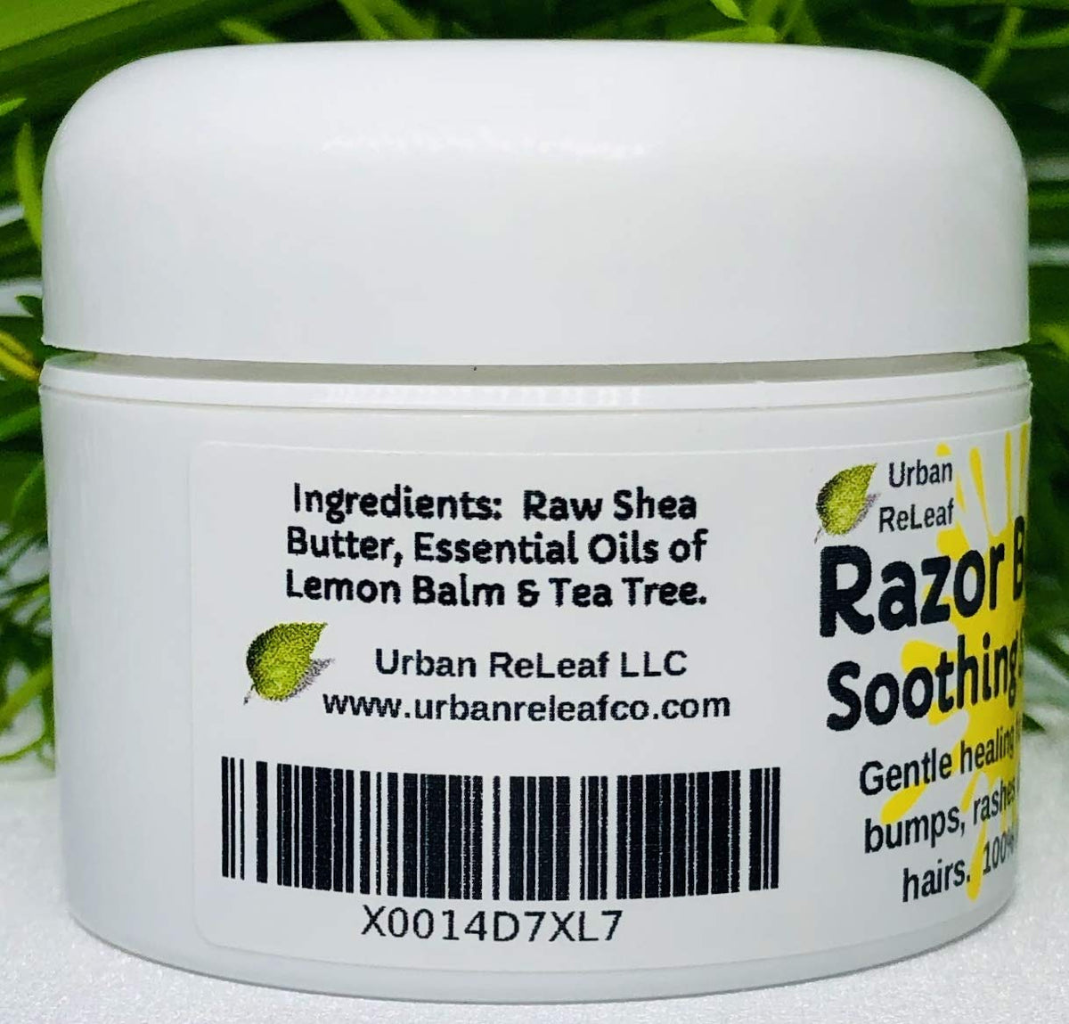 Experience relief with Urban ReLeaf RAZOR BUMP Soothing Salve. This 100% natural salve, enriched with shea butter and tea tree oil, soothes bumps, rashes, and razor burn, making it ideal for face, neck, bikini, and body areas.