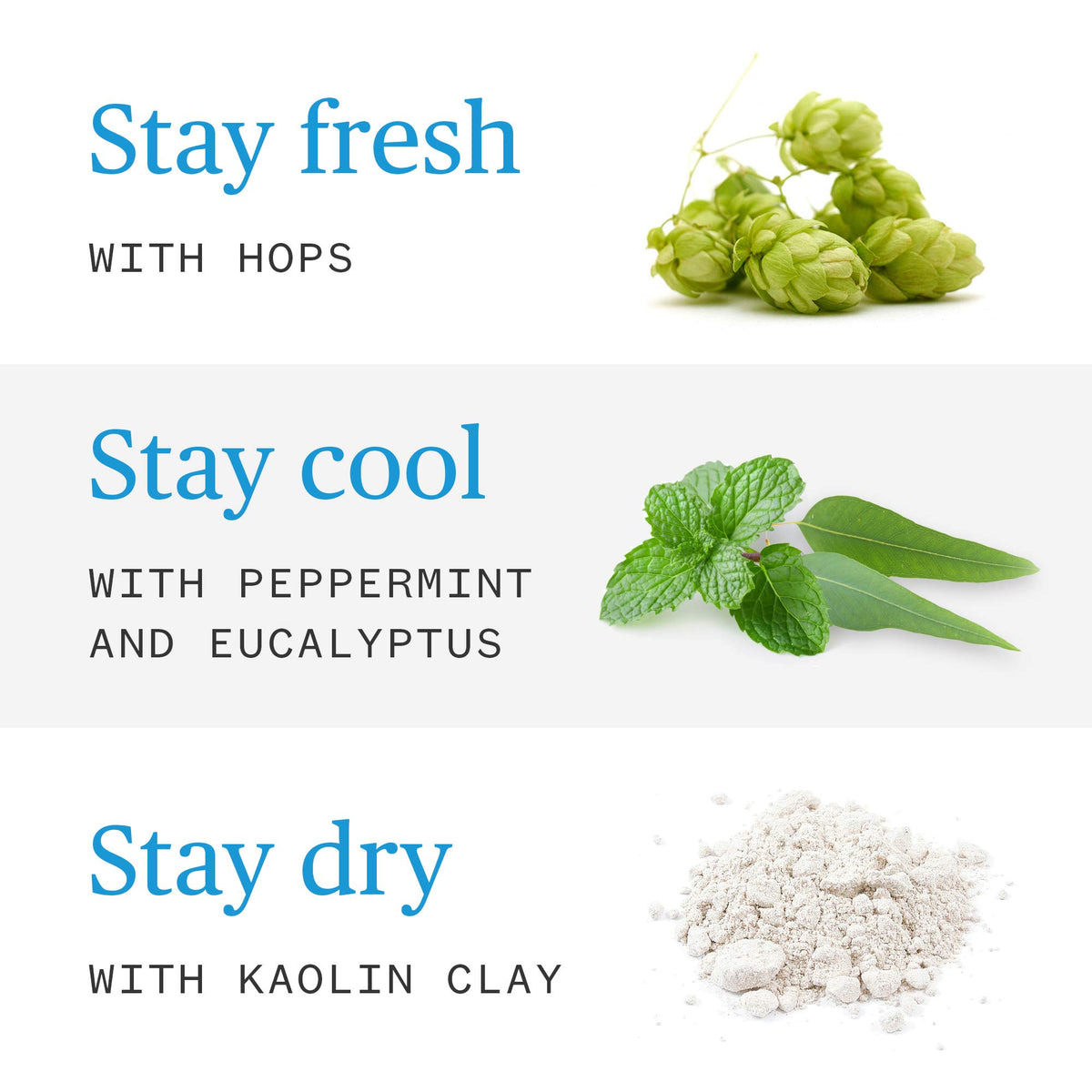 Ingredients :: Full list of ingredients (* denotes organic): Aloe vera (aloe barbadensis) leaf juice*, propanediol, sodium stearate, tapioca starch, silica, microcrystalline cellulose, cellulose gum, shea (butyrosperum parkii) butter (community trade), sodium bicarbonate, kaolin (clay), tocopheryl acetate, glyceryl caprylate, glyceryl undecylenate, glycerin, royal jelly extract, hops (humulus lupulus) extract, lemon (citrus medica limonum) peel extract, ginseng (panax quinquefolium) root extract, calendula officinalis flower extract, matricaria (chamomilla recutita) flower extract, saccharomyces ferment, rosemary (rosmarinus officinalis) leaf oil, peppermint (mentha piperita) oil, grapefruit (citrus grandis) peel oil, eucalyptus (eucalyptus globulus) leaf oil