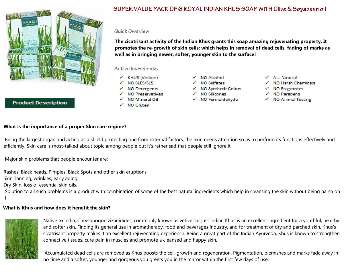 Vetiver Soap (Royal Indian Khus Bar Soap) with Olive and Soybean Oil - Handmade Herbal Soap with 100% Pure Essential Oils - ALL Natural - Each 2.65 Ounces - Pack of 6 (16 Oz) - Vaadi Herbals