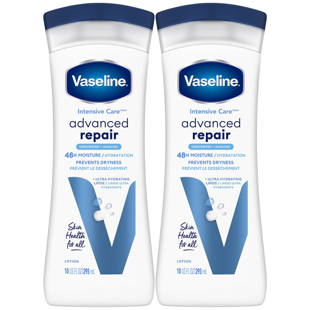 The packaging includes two 10 oz bottles of Vaseline Intensive Care Advanced Repair Fragrance Free Body Lotion.