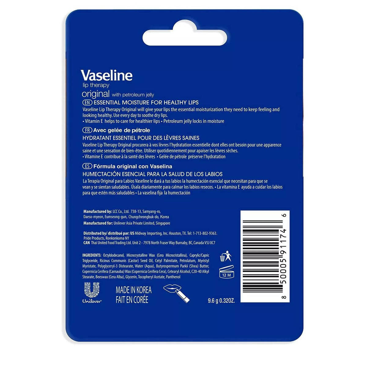 Vaseline Lip Therapy Original with petroleum jelly provides essential moisture for healthy lips. Packaged in a convenient 2-pack, this Vaseline lip balm stick contains Vaseline petroleum jelly to give our lips the essential moisture they need to look and feel healthy. Use every day to soothe dry, chapped lips. Grab a stick for on-the-go to treat dry, peeling, or cracked lips.