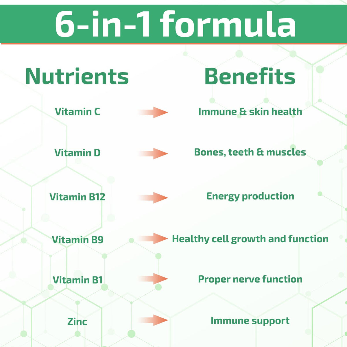Ingredients: Vitamin C, D, Zinc, B12, B9, B1, B6