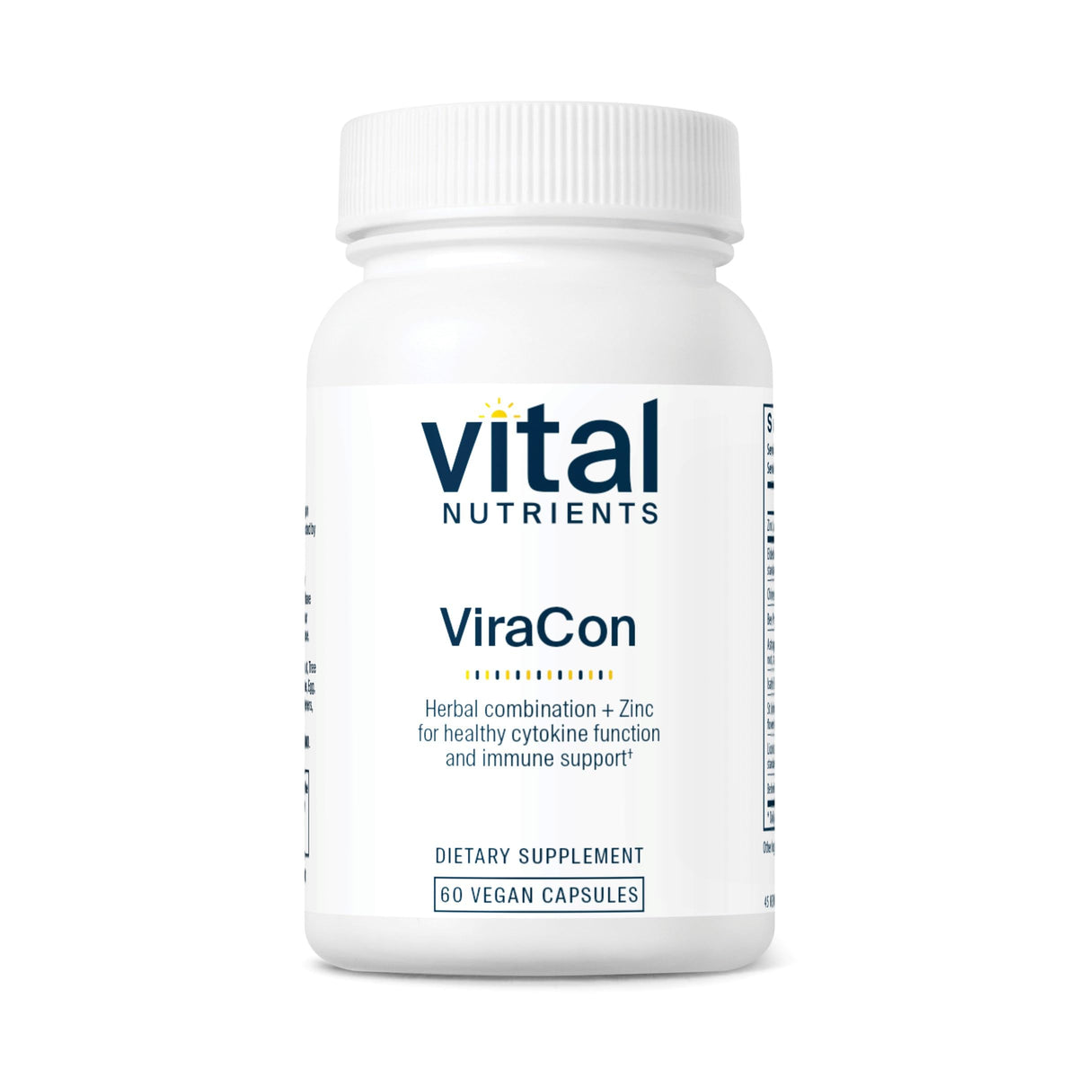 Vital Nutrients ViraCon is a vegan immune support supplement containing Zinc, Elderberry, Licorice Root Extract, and other herbs in a 60-capsule pack. This comprehensive formula provides holistic immune support for overall well-being.