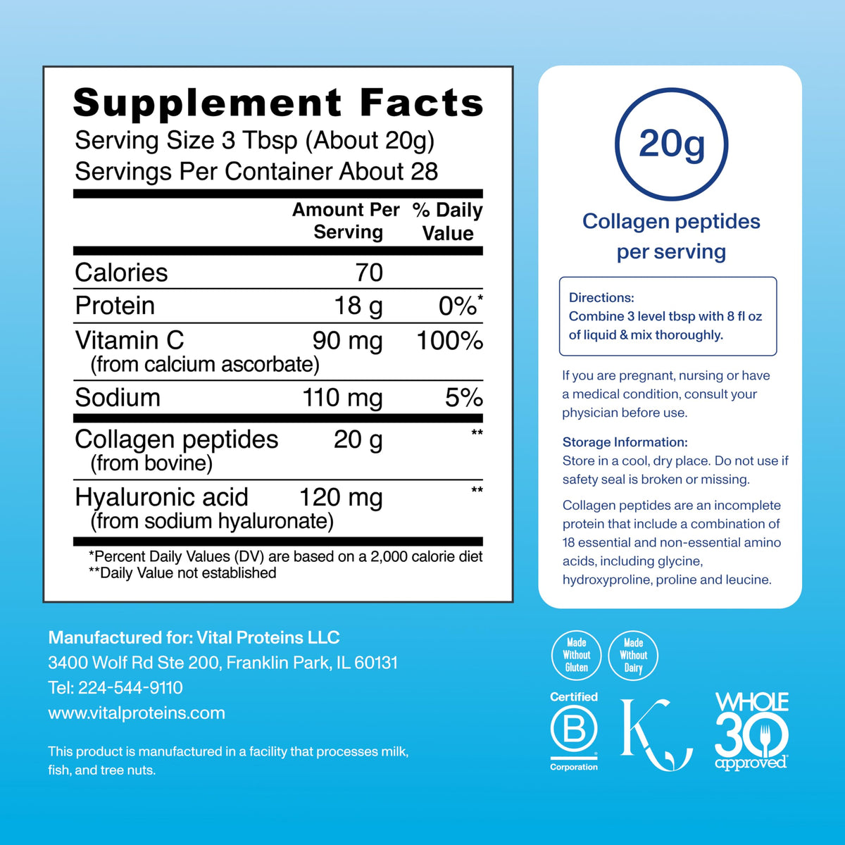 Vital Proteins Collagen Peptides Powder with Hyaluronic Acid and Vitamin C, Unflavored, 20 oz