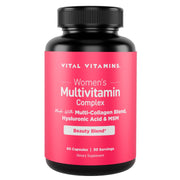 Vital Vitamins Women's Multivitamin Complex is a beauty powerhouse with a Multi-Collagen Blend, Hyaluronic Acid, and MSM. Packed with essential vitamins for radiant skin, hair, and nails.