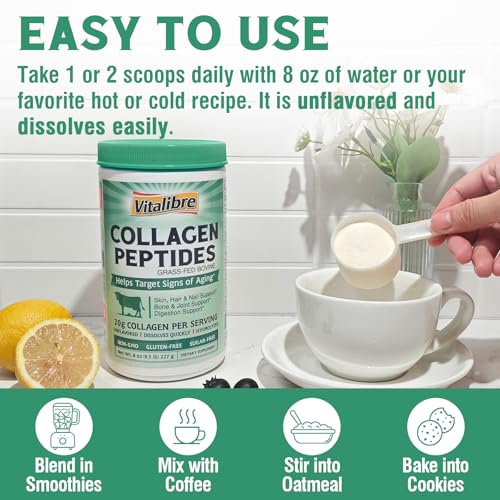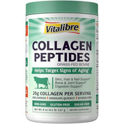 Experience the benefits of Vitalibre Bovine Collagen Peptides Powder, a grass-fed hydrolyzed collagen protein that supports skin, hair, nails, bones, and digestion. Unflavored and versatile for various diets.