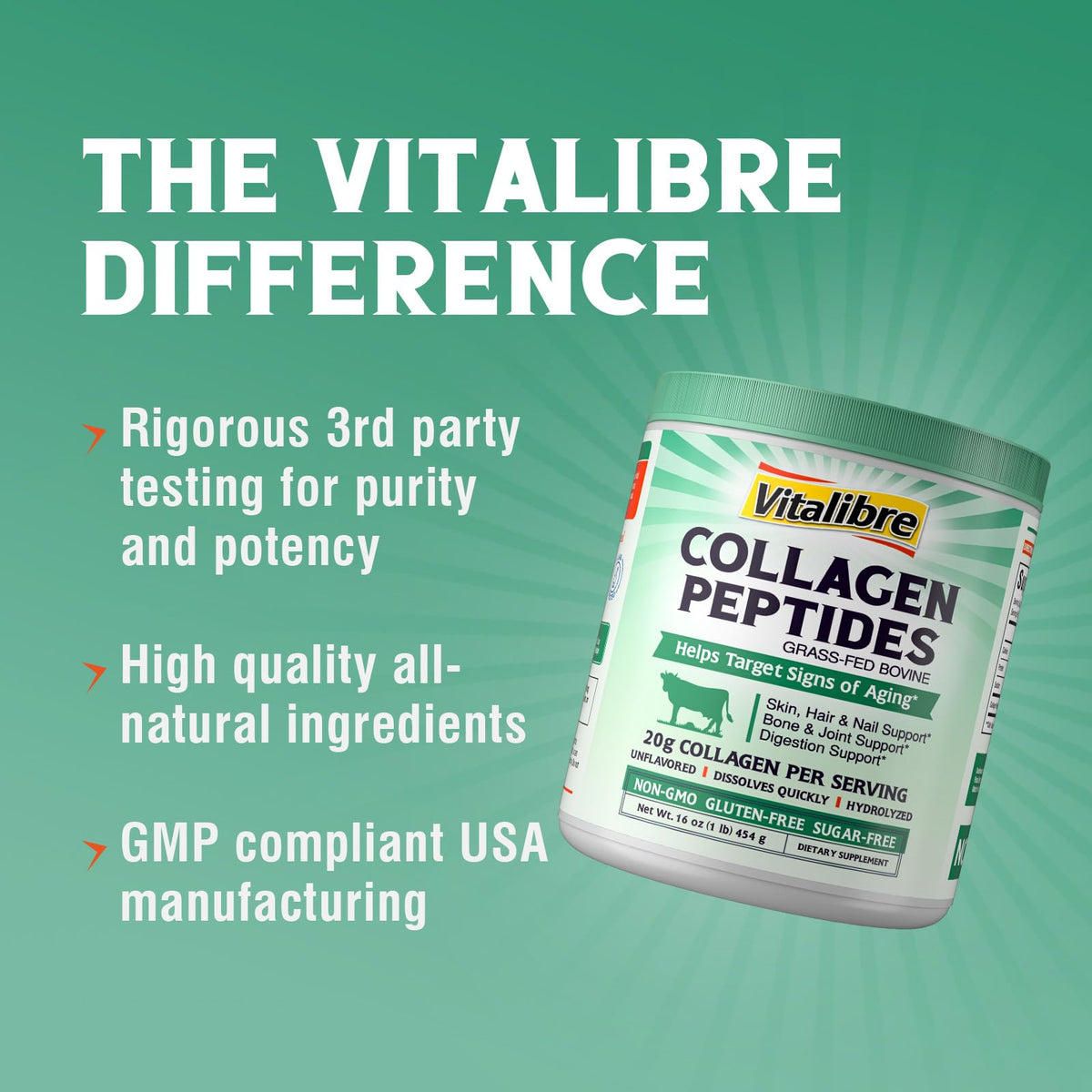 Revitalize your skin, hair, and bones with Vitalibre Bovine Collagen Peptides Powder. This hydrolyzed collagen protein is essential for overall health and well-being, supporting multiple body functions.