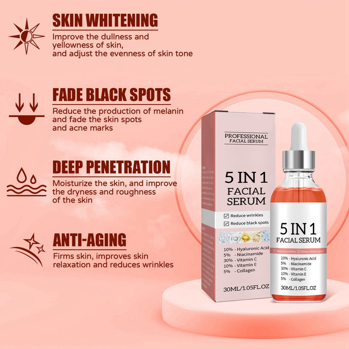 5-in-1 Anti-Aging Vitamin C Face Serum with Hyaluronic Acid and Collagen for moisturizing and firming the skin. Suitable for all skin types.