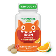 VitaWorks Kids Iron 10mg with Vitamin C Chewable Tablets offer a tasty natural flavored solution for children's blood formation. These vegan, vegetarian, and nut-free chewables provide essential dietary iron support in 120 tablets.