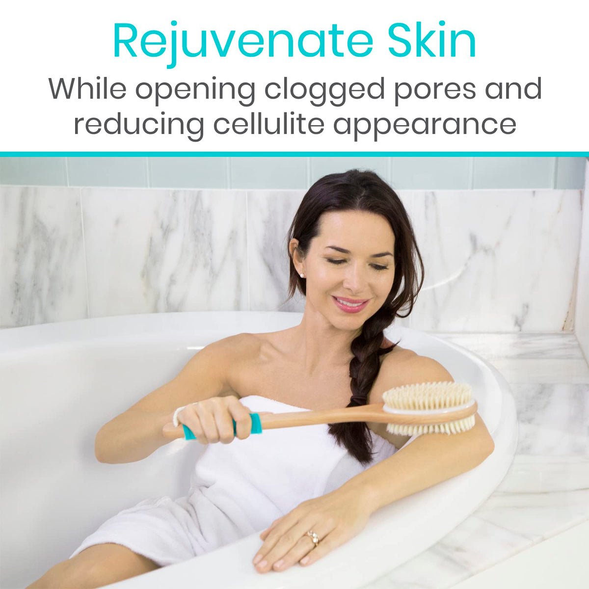 Vive Shower Brush - Dry Skin Body Exfoliator - Shower and Bath Scrubber For Wash Brushing, Exfoliating, Cellulite, Foot Scrub, Leg Exfoliant w/Soft and Stiff Massage Bristles - Wooden Long Handle