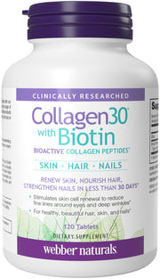 Nourish your skin, hair, and nails with Webber Naturals Collagen30 with Biotin. Each tablet contains 2,500 mg of bioactive collagen peptides and 5,000 mcg of biotin for advanced nourishment. 120 tablets per bottle.