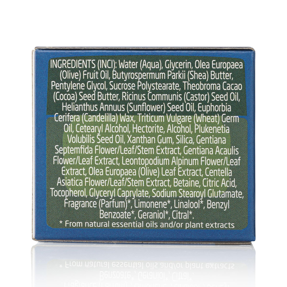 Ingredients: Water Aqua, Glycerin, Olea Europaea Olive Fruit Oil, Butyrospermum Parkii Shea Butter, Pentylene Glycol, Sucrose Polystearate, Theobroma Cacao Cocoa Seed Butter, Ricinus Communis Castor Seed Oil, Helianthus Annuus Sunflower Seed Oil, Euphorbia Cerifera Candelilla Wax, Triticum Vulgare Wheat, Germ Oil, Cetearyl Alcohol, Hectorite, Alcohol, Plukenetia Volubilis Seed Oil, Xanthan Gum, Silica, Gentiana Septemfida FlowerLeafStem Extract, Gentiana Acaulis FlowerLeaf Extract, Leontopodium Alpinum FlowerLeaf Extract, Olea Europaea Olive Leaf Extract, Centella Asiatica FlowerLeafStem Extract, Betaine, Citric Acid, Tocopherol, Glyceryl Caprylate, Sodium Stearoyl Glutamate, Fragrance Parfum, Limonene, Linalool, Benzyl Benzoate, Geraniol, Citral.