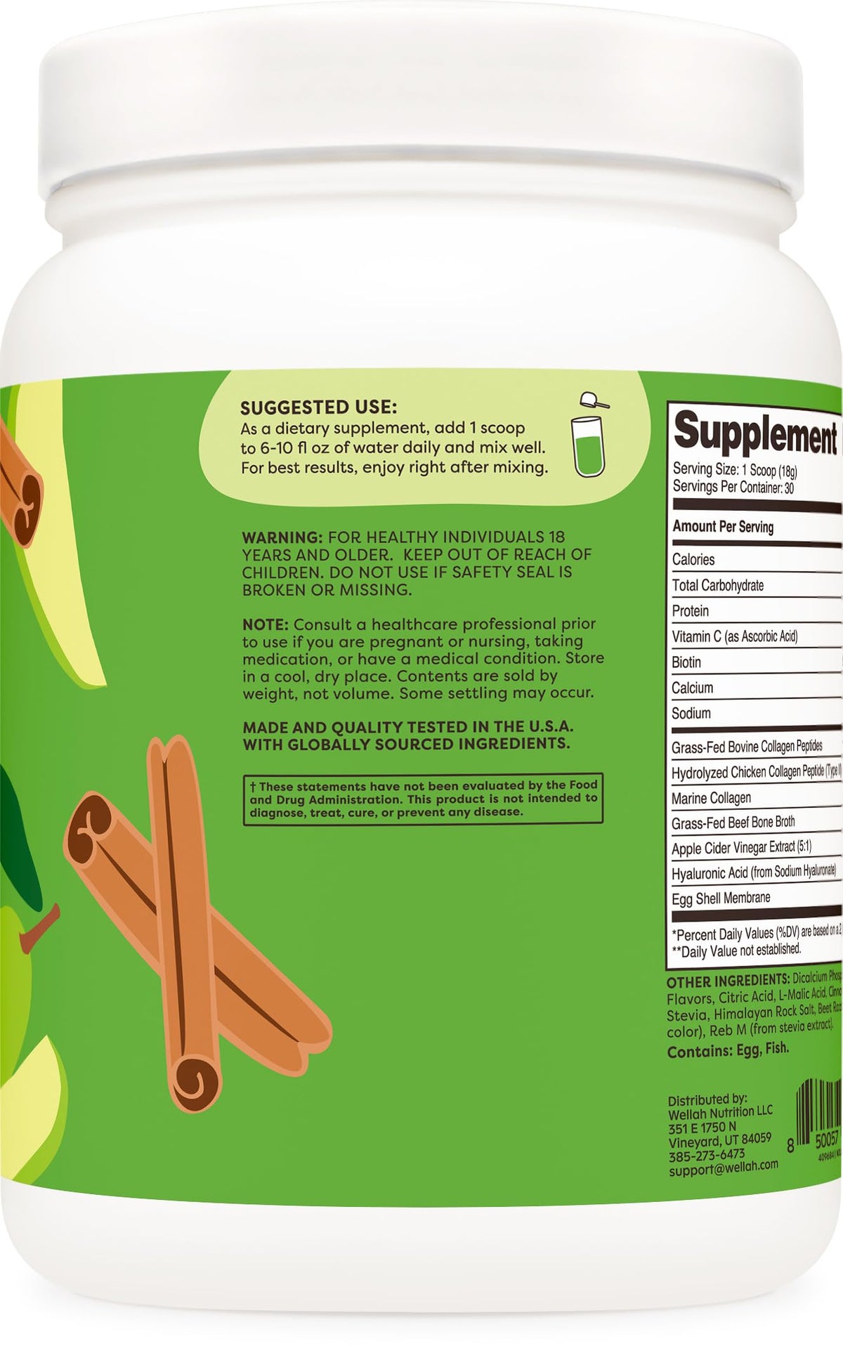 Ingredients: GrassFed Bovine Collagen Peptides, Hydrolyzed Chicken Collagen Peptide Type II, Marine Collagen, GrassFed Beef Bone Broth, Apple Cider Vinegar Extract 51, Hyaluronic Acid from Sodium Hyaluronate, Egg Shell Membrane, DiCalcium Phosphate, Natural Flavors, Citric Acid, LMalic Acid, Cinnamon Powder, Stevia, Himalayan Rock Salt, Beet Root Powder For Color, Reb M From Stevia Extract.