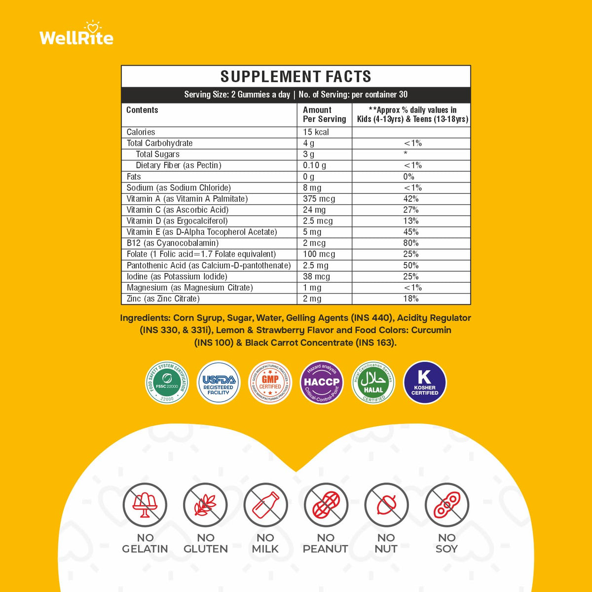 Wellrite Kids Multivitamin & Mineral Gummy Vitamins which Provide Overall Development & Growth, 60 Count, Lemon & Strawberry Flavored, Vegan, Gelatin Free, Gluten Free, Nut Free