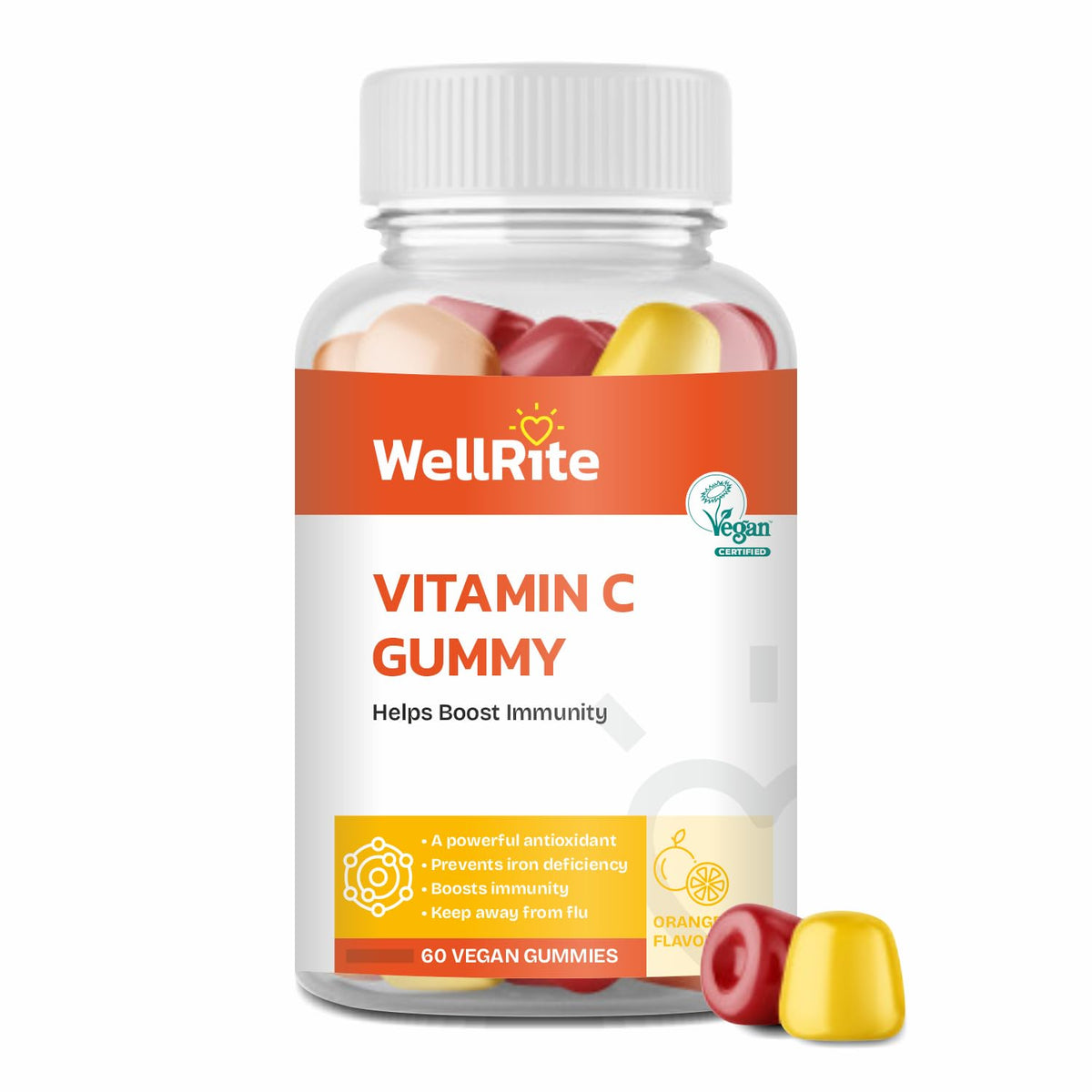 Wellrite Vitamin C Gummy Vitamins help boost immunity with a delicious orange flavor. These vegan, gelatin-free, and gluten-free gummies are rich in antioxidants and prevent iron deficiency.