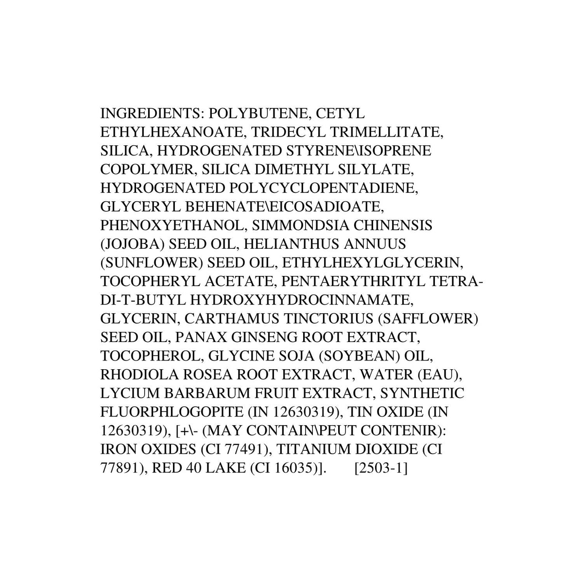 Ingredients :: POLYBUTENE, CETYL ETHYLHEXANOATE, TRIDECYL TRIMELLITATE, SILICA, HYDROGENATED STYRENE/ISOPRENE COPOLYMER, SILICA DIMETHYL SILYLATE, HYDROGENATED POLYCYCLOPENTADIENE, GLYCERYL BEHENATE/EICOSADIOATE, PHENOXYETHANOL, SIMMONDSIA CHINENSIS (JOJOBA) SEED OIL, HELIANTHUS ANNUUS (SUNFLOWER) SEED OIL, ETHYLHEXYLGLYCERIN, TOCOPHERYL ACETATE, PENTAERYTHRITYL TETRA-DI-T-BUTYL HYDROXYHYDROCINNAMATE, GLYCERIN, CARTHAMUS TINCTORIUS (SAFFLOWER) SEED OIL, PANAX GINSENG ROOT EXTRACT, TOCOPHEROL, GLYCINE SOJA (SOYBEAN) OIL, RHODIOLA ROSEA ROOT EXTRACT, WATER (EAU), LYCIUM BARBARUM FRUIT EXTRACT, SYNTHETIC FLUORPHLOGOPITE (IN 12630319), TIN OXIDE (IN 12630319), +/- (MAY CONTAIN/PEUT CONTENIR): IRON OXIDES (CI 77491), TITANIUM DIOXIDE (CI 77891), RED 40 LAKE (CI 16035). 2503-1