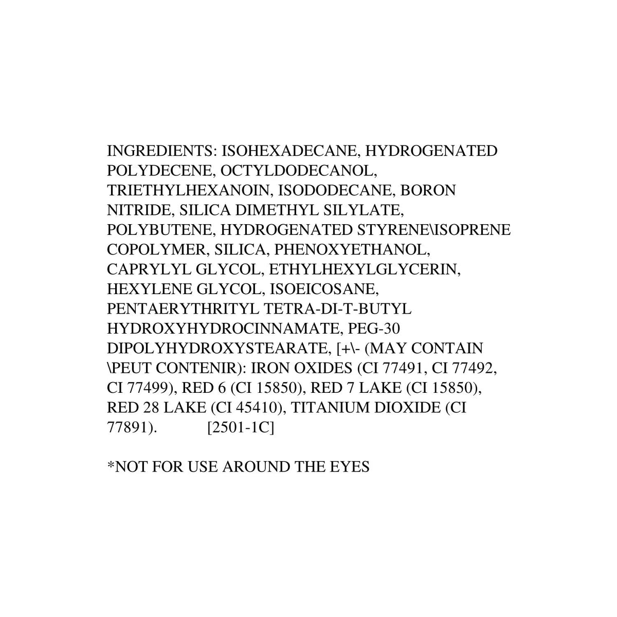 Ingredients :: ISOHEXADECANE, HYDROGENATED POLYDECENE, OCTYLDODECANOL, TRIETHYLHEXANOIN, ISODODECANE, BORON NITRIDE, SILICA DIMETHYL SILYLATE, POLYBUTENE, HYDROGENATED STYRENE/ISOPRENE COPOLYMER, SILICA, PHENOXYETHANOL, CAPRYLYL GLYCOL, ETHYLHEXYLGLYCERIN, HEXYLENE GLYCOL, ISOEICOSANE, PENTAERYTHRITYL TETRA-DI-T-BUTYL HYDROXYHYDROCINNAMATE, PEG-30 DIPOLYHYDROXYSTEARATE, +/- (MAY CONTAIN/PEUT CONTENIR): IRON OXIDES (CI 77491, CI 77492, CI 77499), RED 6 (CI 15850), RED 7 LAKE (CI 15850), RED 28 LAKE (CI 45410), TITANIUM DIOXIDE (CI 77891). 2501-1C *NOT FOR USE AROUND THE EYES
