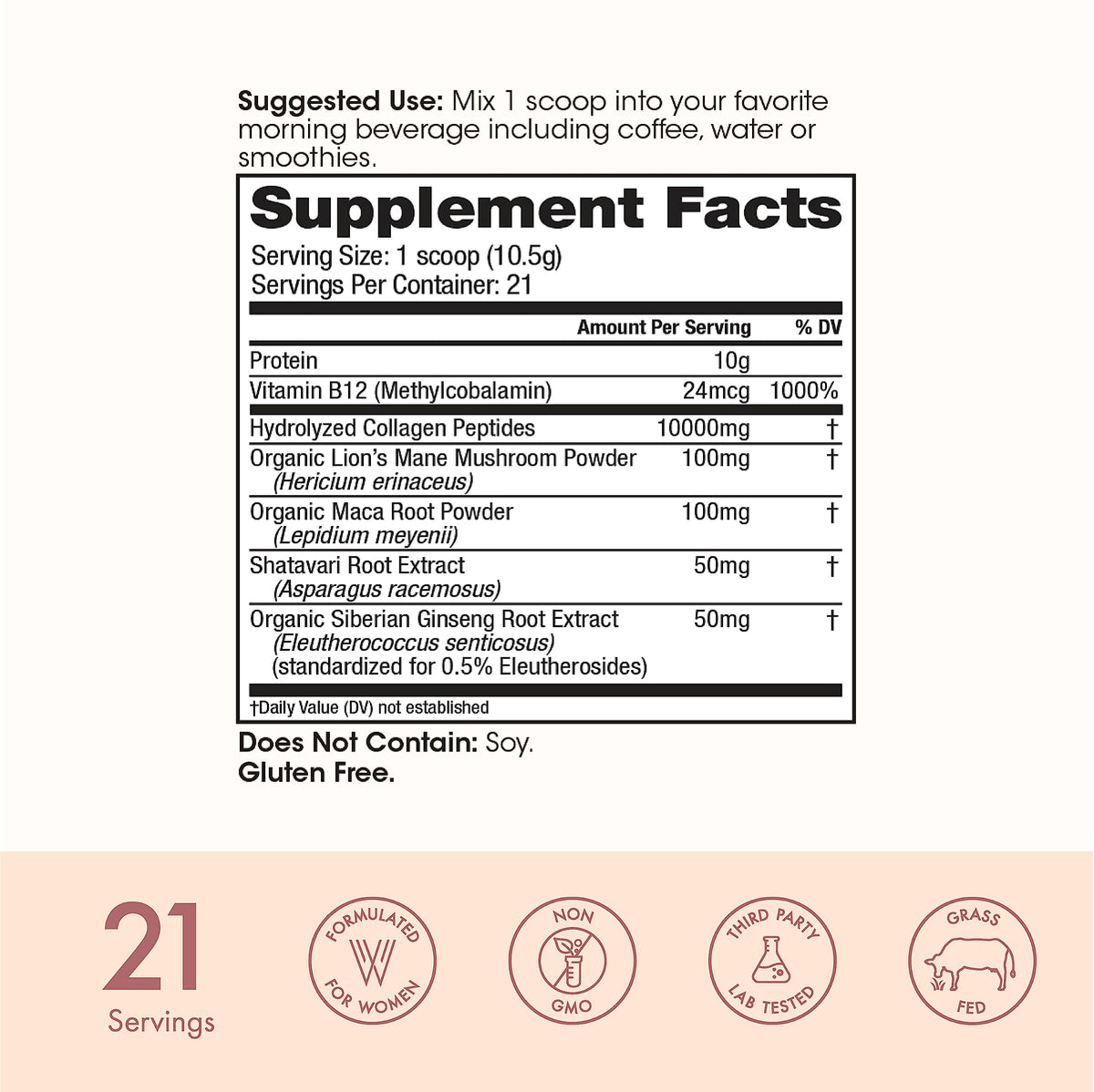 Ingredients :: Protein, Vitamin B12, Hydrolyzed Collagen Peptides, Hericium erinaceus, Lepidium meyenii, Asparagus racemosus, Eleutherococcus senticosus