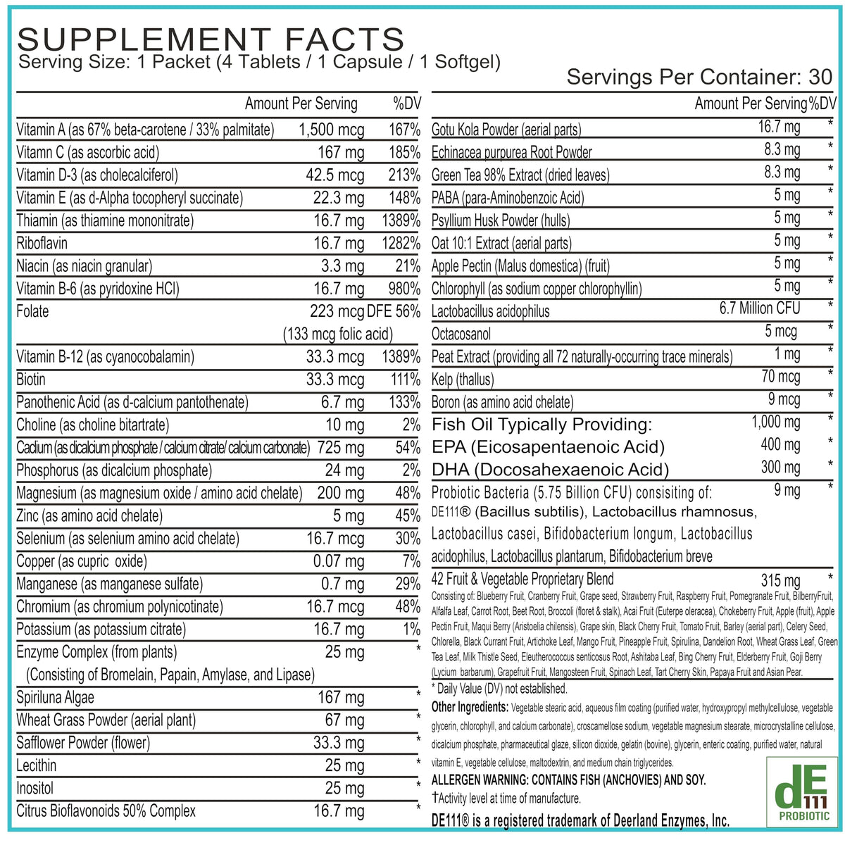 Ingredients: Vit A, Vit C, Vit D3, Vit E, Thiamin, Riboflavin, Niacin, Vitamin B6, Folate, Vitamin B12, Biotin, Panothenic Acid, Choline, Calcium, Iron, Iodine, Magnesium, Zinc, Selenium, Copper, Manganese, Chromium, Potassium, etc.