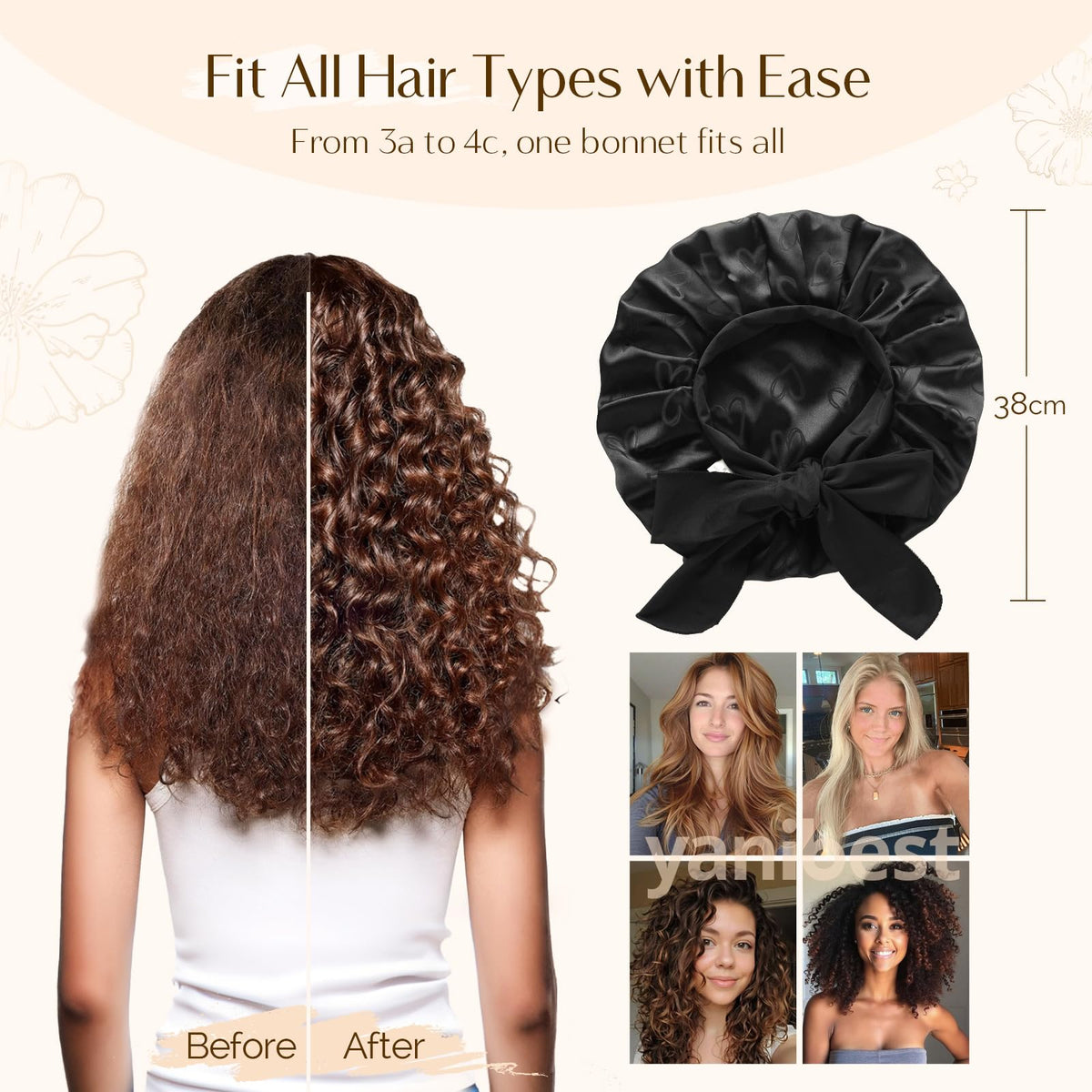 YANIBEST Adjustable Satin Bonnet for Sleeping, Double Layer Silk Bonnet with Tie Band for Women, Sleep Cap Curly Natural Hair, Black