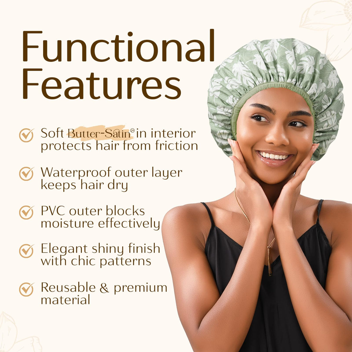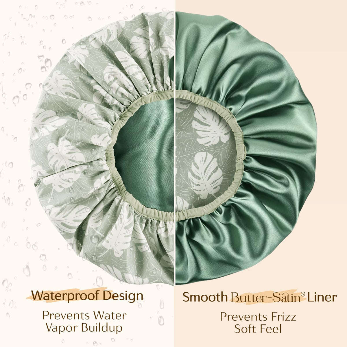 - Reusable and Waterproof Shower Cap with 2 Layers. The outer layer is made of waterproof material to easily keep hair dry and clean during showers. The hair cap holds hair securely, fits closely, and prevents water droplets from entering. Soft Butter-Satin interior protects hair from friction and ensures comfortable wear