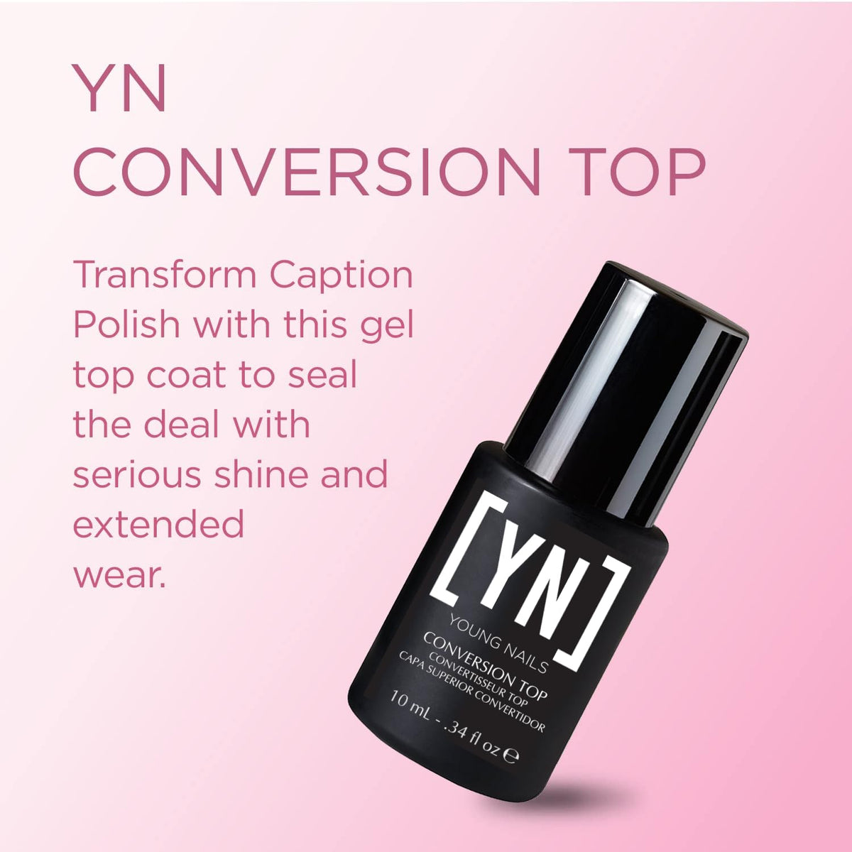 Enhance your nail color with Young Nails Caption Conversion Top. This 0.33 fl. oz. topcoat provides a glossy finish and protects your nail color, ensuring a long-lasting and vibrant manicure.