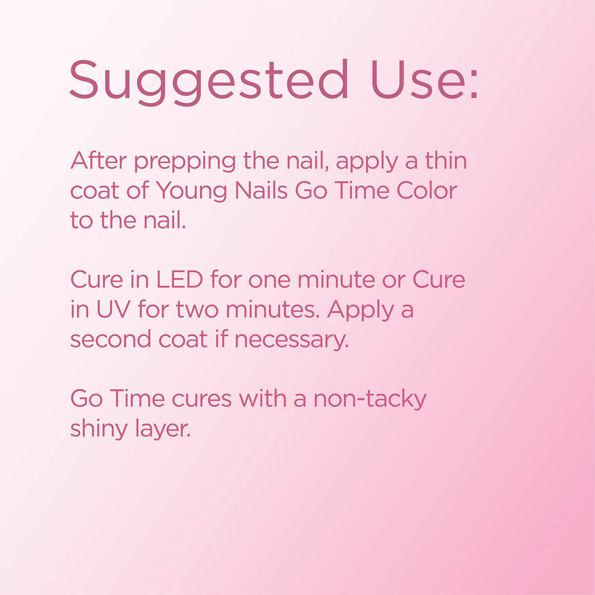 Specific Uses For Product :: Apply a thin coat of Young Nails Go Time Color to nail. Cure in LED for one minute or Cure in UV for two minutes. Apply second coat if necessary. Go Time cures with a non tacky shiny layer.
