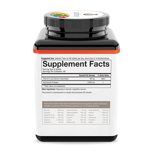 Ingredients: Serving Size 6 tablets Servings Per Container 48 Vitamin C as Calcium Ascorbate 90 mg 100 DV Hydrolvzed Collagen 6,000 mg Dailv Value not established Other Ingredients Magnesium stearate vegetable source