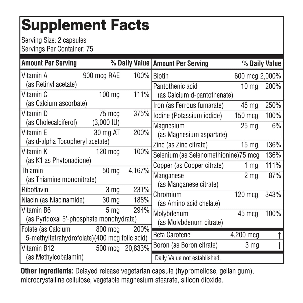 Ingredients: Vitamin A RAE as Retinyl acetate 900 mcg, Vitamin C as Calcium ascorbate 100 mg, Vitamin Das Cholecalciferol 75 mcg 3,000 IU, Vitamin E as dalpha Tocopheryl acetate 30 mg AT, Vitamin K as K1 as Phytonadione 120 mcg, Thiamin as Thiamine mononitrate 50 mg, Riboflavin 3 mg, Niacin as Niacinamide 30 mg, Vitamin B6 as Pyridoxal 5phosphate monohyd 5 mg,Folate as Calcium 5methyltetrahydrofolate 400 mcg folic Acid 800 mcg, Vitamin B12 as Methylcobalamin 500 mcg, Biotin 600 mcg, Pantothenic acid as Calcium dpantothenate 10 mg, Iron as Ferrous fumarate 45 mg, lodine Potassium iodide 150 mcg, Magnesium as Magnesium aspartate 25 mg, Zinc as Zinc citrate 15 mg, Selenium as Selenomethionine 75 mcg, Copper as Copper citrate1 mg, Manganese as Manganese citrate2 mg, Chromium as Amino acid chelate 120 mcg, Molybdenum as Molybdenum citrate 45 mcg, Beta Carotene 4,200 mcg, Boron as Boron citrate 3 mg. Other Ingredients Delayed release vegetarian capsule hypromellose, gellan gum, microcrystalline cellulose, vegetable magnesium stearate, silicon dioxide.