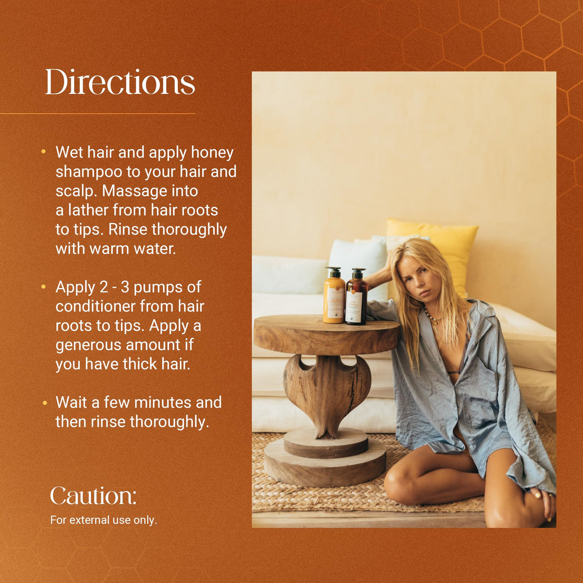 Directions :: Wet hair and apply honey shampoo to your hair and scalp. Massage into a lather from hair roots to tips. Rinse thoroughly with warm water., Apply 2 - 3 pumps of Conditioner from hair roots to tips. Apply a generous amount if you have thick hair. Wait a few minutes and then rinse thoroughly., For deeper hydration, softness and nourishment, treat your hair with Yucatan Herbal Honey Hair Mask and Hair Oil.