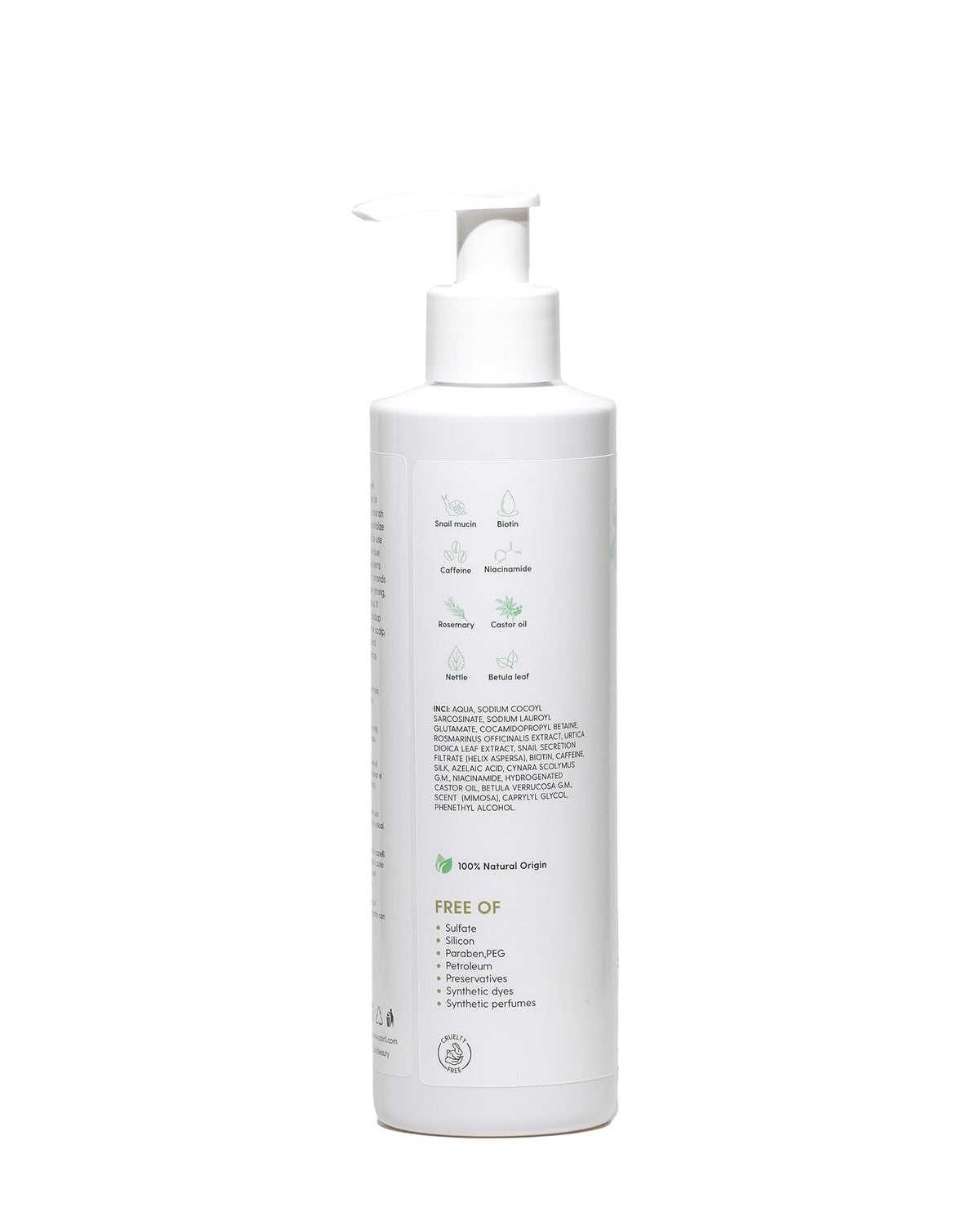 Ingredients: AQUA, SODIUM COCOYL SARCOSINATE, SODIUM LAUROYL GLUTAMATE, COCAMIDOPROPYL BETAINE, ROSMARINUS OFFICINALIS EXTRACT, URTICA DIOICA LEAF EXTRACT, SNAIL SECRETION FILTRATE HELIX ASPERSA, BIOTIN, CAFFEINE, SILK, AZELAIC ACID, CYNARA SCOLYMUS G.M., NIACINAMIDE, HYDROGENATED CASTOR OIL, BETULA VERRUCOSA G.M., SCENT MIMOSA, CAPRYLYL GLYCOL, PHENETHYL ALCOHOL