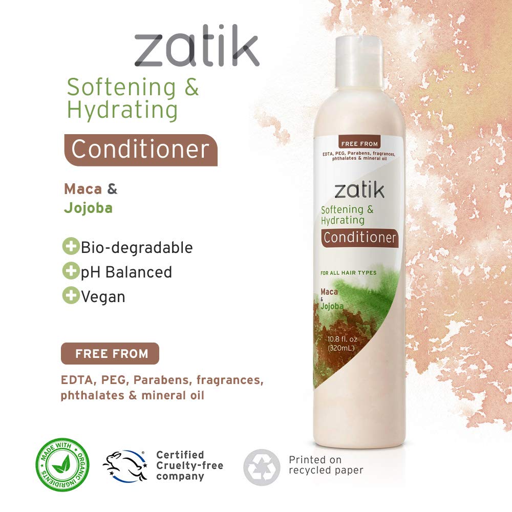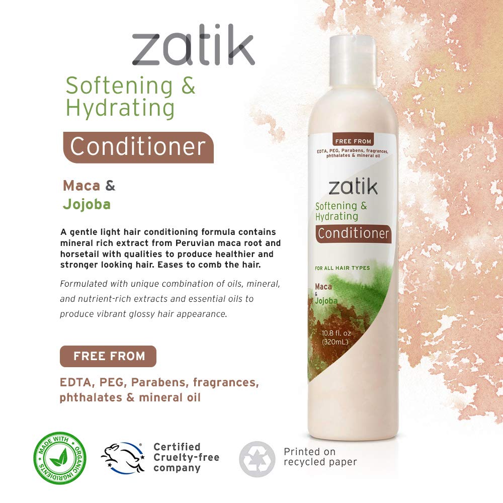 Revitalize your hair with Zatik Naturals Softening & Hydrating Conditioner. Formulated with Maca and Jojoba, this color-protecting conditioner is vegan, pH balanced, and free from harmful chemicals, leaving your hair soft, hydrated, and vibrant.