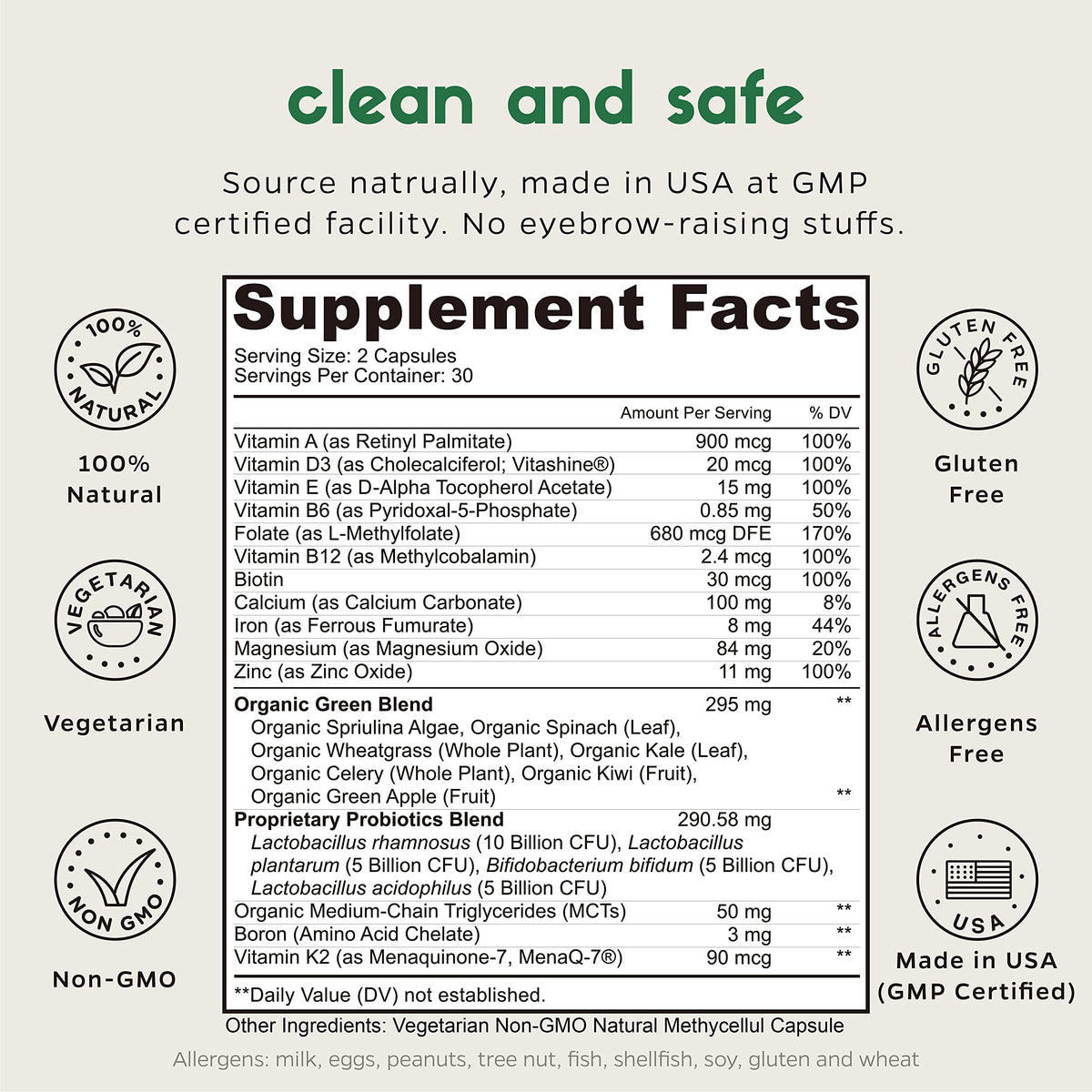 Ingredients: Vitamin A as Retiny Palmitate, Vitamin D3 as Cholecalciferol Vitashine, Vitamin E as DAlpha Tocopherol Acetate, Vitamin B6 as Pyridoxal5Phosphate, Folate as LMethylfolate, Vitamin B12 as Methylcobalamin, Biotin, Calcium as Calcium Carbonate, Iron as Ferrous Fumurate, Magnesium as Magnesium Oxide, Zinc as Zinc Oxide, Organic Green Blend Organic Spirulina Algae, Organic Spinach Leaf, Organic Wheatgrass Whole Plant, Organic Kale Leaf, Organic Celery Whole Plant, Organic Kiwi Fruit, Organic Green Apple Fruit, Proprietary Probiotics Blend Lactobacillus rhamnosus 10 Billion CFU, Lactobacillus plantarum 5 Billion CFU, Bifidobacterium bifidum 5 Billion CFU, Lactobacillus acidophilus 5 Billion CFU, Organic MediumChain Triglycerides MCTs, Boron Amino Acid Chelate, Vitamin K2 as Menaquinone7, MenaQ7, Methylcellulose Capsule